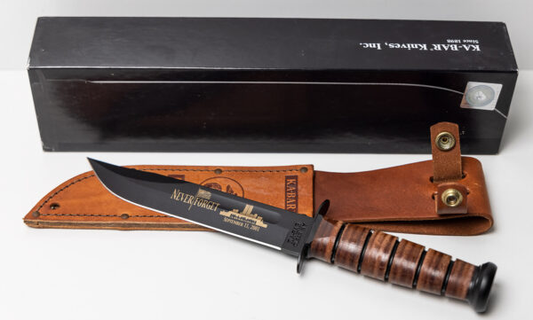 KA-BAR Knife Model 02-9164 Marked US ARMY 1095 cro-van Blade Steel Rockwell Hardness is 56-58 United States Army Commemorative Knife Flat Ground with Gold Etching on Frontside of Blade that reads “Never Forget” September 11, 2001 Handle is Leather Comes with a leather sheath stamped KA-BAR US Army on the front Knife is NEW in the box NEVER used, sharpened or carried Made in the USA Overall length 11 7/8″ Blade Length 7″